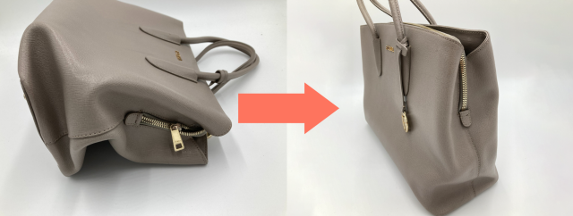 といった【全体的な】型崩れの場合、プロならばバッグの構造に併せて「外側」だけでなく「内側」からも修理できるので、再発を防ぎなるべく長く綺麗に使用できるようになるでしょう。